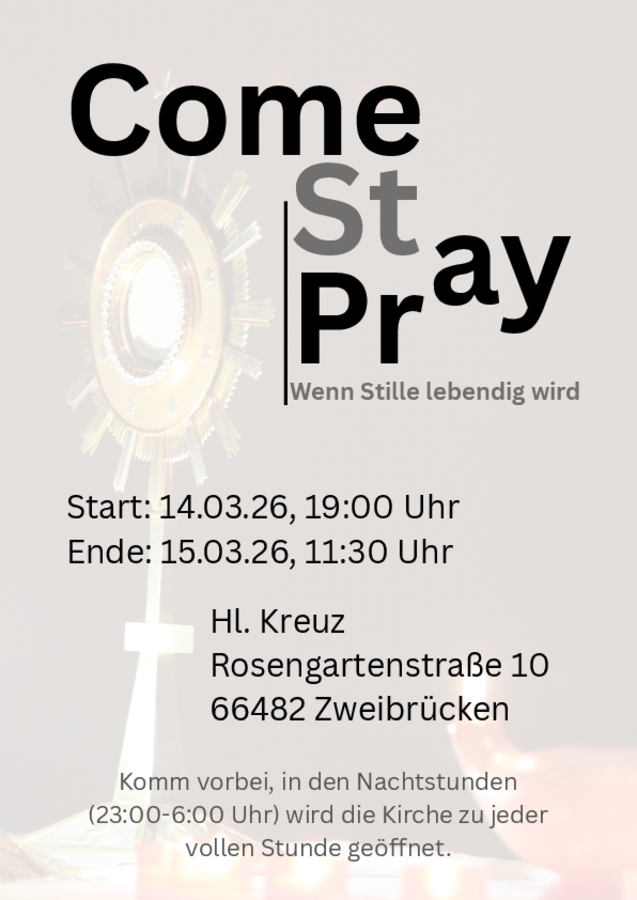Am Samstag, den 14.03. und Sonntag, den 15.03. veranstalten die Jugendgruppen unserer Pfarrei Hl. Elisabeth eine „Nacht der offenen Kirche“. Unter dem Motto Come, Stay & Pray (übersetzt: Komm vorbei, bleibe & bete) wird eine Nacht der Anbetung in der Hl. Kreuz-Kirche stattfinden. Gerade in der Fastenzeit wollen wir uns auf unsere Beziehung zu Jesus konzentrieren und ihm Platz in unserem Leben einräumen.