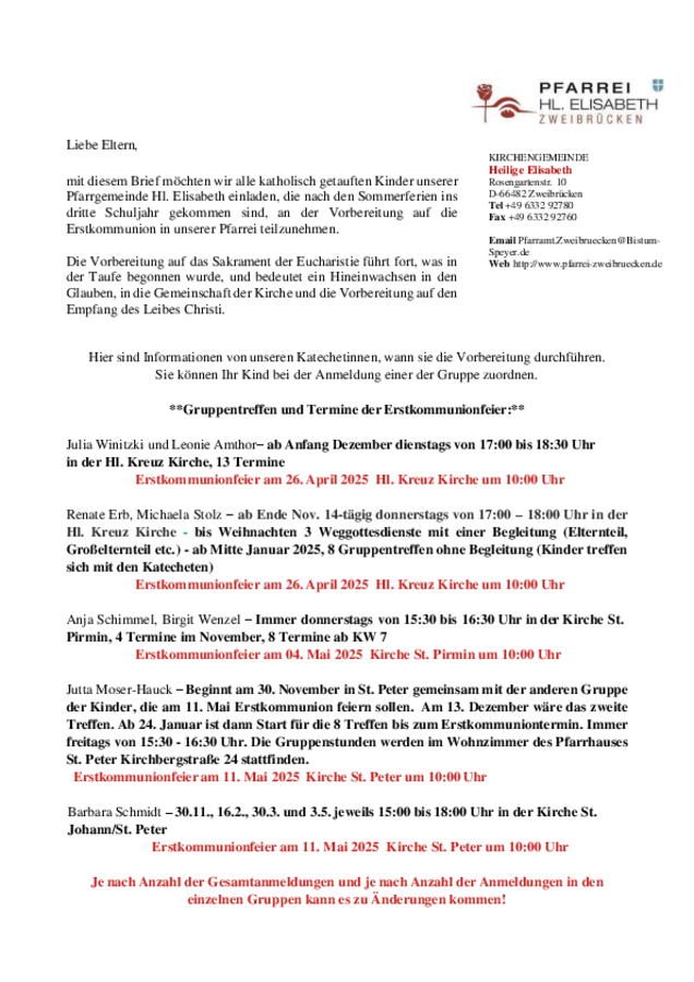 ganz herzlich möchten wir Sie von unserer Pfarrei Heilige Elisabeth grüßen. Nach der Taufe ist die Erstkommunion ein weiterer Schritt Ihres Kindes, in die Gemeinschaft der Kirche aufgenommen zu werden, also in die Gemeinschaft derer, die an Jesus Christus glauben. In unserer Pfarrei ist es üblich, dass die Kinder, die nach den Sommerferien die 3. Klasse besuchen, sich auf die Erstkommunion vorbereiten. Hierzu möchten wir herzlich einladen.Und selbstverständlich sind auch Sie als Eltern und Erziehungsberechtigte eingeladen, diesen Weg mitzugehen. Wir freuen uns, wenn Sie Interesse haben und Ihr Kind im kommenden Jahr die Erstkommunion empfangen möchte. Die Einladungen zur Vorbereitung wurden jetzt verschickt. Gerne können Sie sich auch im Pfarrbüro (Tel.: 06332-92780) informieren, falls Sie Fragen haben oder wenn Sie Ihr Kind zur Erstkommunion anmelden wollen, aber keine Einladung erhalten haben.